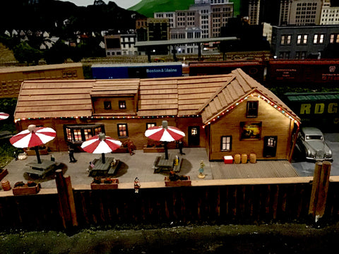 Some years back I made an English Pub for my layout, which my wife named “The Wet Whistle”. It’s been great as a scene on the river front but I realized that with Christmas coming up it was time to give it a bit of a lift. How about some Christmas lights? I loathe putting these on my house and taking them down in the dead of winter. However, my basement is the ideal spot, so I decided, let’s do it.